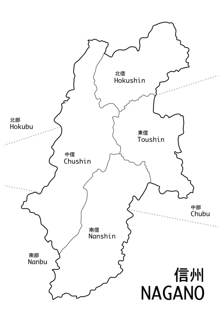 中信(ちゅうしん)地方、南信(なんしん)地方、北信(ほくしん)地方、東信(とうしん)地方の区分けは↓が分かりやすいのかな?と思います。