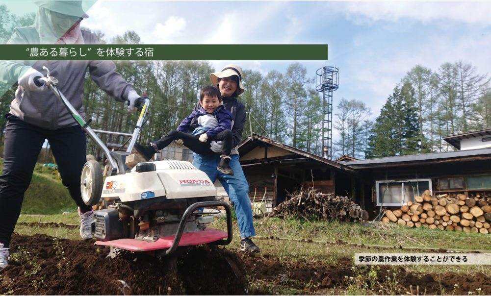 宿でできる農業体験はその季節の仕事のほか希望を聞いてハーブティづくりや雪遊び、秋の収穫体験などを一緒に行う。ミックスの犬てんてん(7才)とモリ―ユ(2才)とともに近所を歩く朝の犬の散歩も人気。「田舎で子育てしている私たちの暮らしの経験を生かし移住希望の方の相談に」。