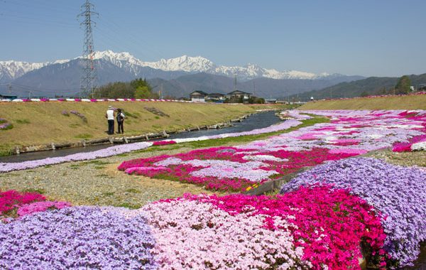 長野県大町市の東山山麓沿いを流れる「農具川」沿いには、地域の人たちが整備する散策路があります。四季折々の花が美しく、北アルプスをバックにとっても映える美しい写真を撮影できます。