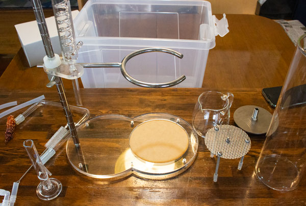 ふたはふつうのものでもできますが、ガラス製だと中が見えるので空焚きの危険が少なくなるように思います。ガラスのふたは多くの場合、穴の開いていないものが多いので、それも蒸留にぴったりです。